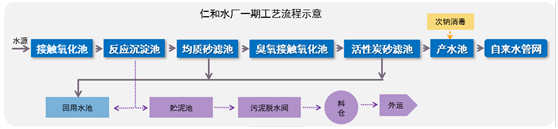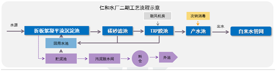 仁和水厂的净水工艺在常规工艺的基础上,采用了目前较为先进的第三代自来水厂超滤膜工艺:混凝沉淀+砂滤+浸没式超滤+消毒,以膜法工艺作为自来水处理的最后一重保障。